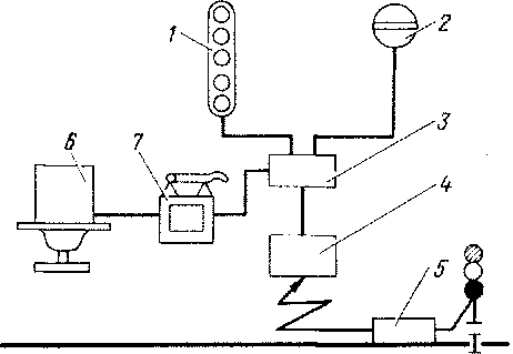 / — локомотивный светофор; 2 — генератор; 3 —- при-емно-управляюшие приборы; 4 — локомотивный приемник; 5 — путевые устройства; 6 — электропневматический клапан; 7 — рукоятка бдительности