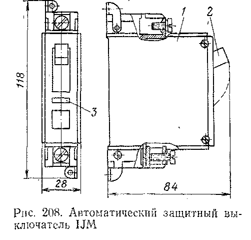 Разрыв дуги происходит в дугогасительной камере с деионизацион-ной решеткой. Дугогасительная камера, как и весь механизм АЗВ, помещена в бакелитовом корпусе / (рис. 208), который монтируют на электровозе с помощью двух винтов М4. Так как гашение дуги осуществляется с помощью постоянного магнита, то при монтаже АЗВ необходимо соблюдать полярность его включения. По той же причине не рекомендуется устанавливать АЗВ непосредственно на каркасах из стали и других магнитных материалов. На лицевой стороне АЗВ расположен рычажок 2, с помощью которого можно вручную включить и выключить АЗВ, и сигнальный флажок 3 зеленого цвета, выпадающий при автоматическом срабатывании АЗВ. После автоматического выключения АЗВ рычажок остается во включенном (верхнем) положении, и для повторного, включения необходимо его вернуть в выключенное (нижнее) положение, а затем опять включить.