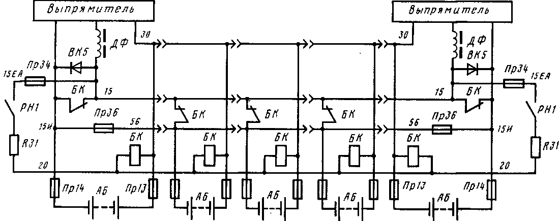 В процессе заправки электропоезда при включении рубильников батареи БР питание цепей управления осуществляется от аккумуляторных батарей через размыкающий контакт 15-15И (56-15 на прицепных вагонах) контактора БК. При наличии напряжения на проводе 15ЕА через размыкающий контакт реле РМН включается контактор КТ, который подключает первичную обмотку трансформатора к источнику переменного напряжения 220 В. Если напряжение питания выше 185 В, срабатывает реле РН1 и своим замыкающим контактом 15ЕА-15ЕЛ через резистор R31 подает питание на поездной провод 20, к которому подключены параллельно все катушки контакторов БК. Если работает хотя бы одна установка, все контакторы БК включены и все аккумуляторные батареи работают в режиме заряда от одной установки.