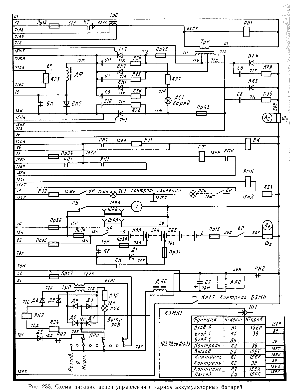 Аккумуляторная батарея от перегрузок защищена предохранителями Пр14, Пр15, а цепь параллельного соединения батарей (поездной провод 56) — предохранителем ПрЗб (см. рис. 233). Входные цепи блоков БУР, БЗМН (провод 15ЕА) защищены предохранителем Пр34, а цепь питания блока ускоренного отключения ВВ (секционный провод 22) — предохранителем ПрЗЗ.