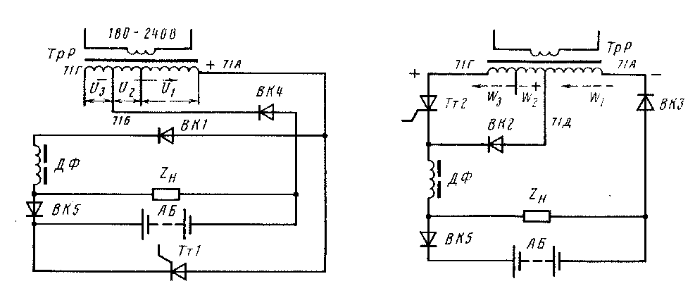 К выводам вторичной обмотки подсоединены тиристоры Tri и Тт2 и вентили ВК1—ВК4, образующие несимметричный двухполупериодный мостовой выпрямитель. Тиристор Тт2 подключен параллельно вентилю ВК2 и создает дополнительное управляемое плечо моста для питания цепей управления и подзаряда аккумуляторной батареи. Заряд батареи осуществляется также через тиристор Tri, образующий однополупериодный управляемый выпрямитель. Вентиль ВК5 разделяет цепи нагрузки и батареи.