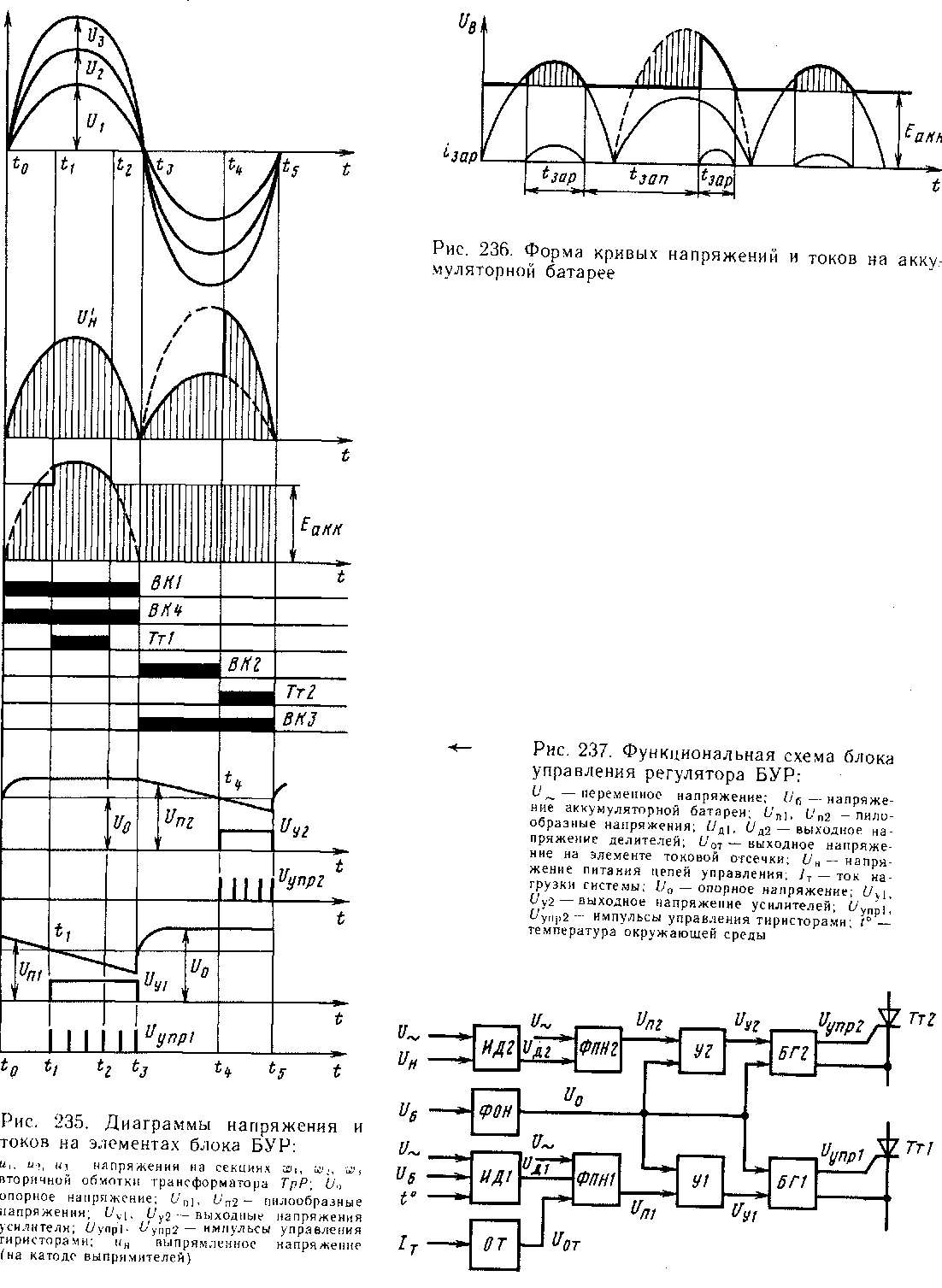 Средние значения напряжений в цепях управления UH и заряда батареи U6 пропорциональны заштрихованным площадям на кривых изменения напряжения (см. рис. 235) и зависят от момента включения и интервала проводимости тиристоров Тт2 и Tri.