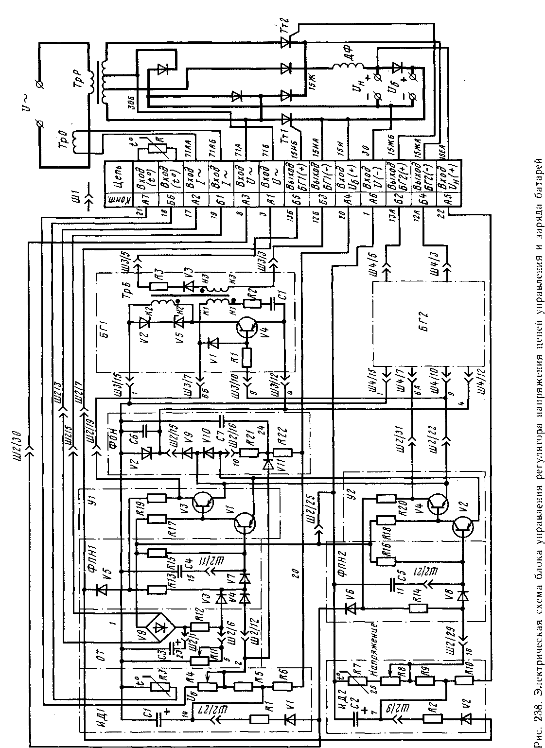 Функциональная схема блока управления регулятора напряжения цепей управления и заряда батарей БУР представлена на рис. 237, а электрическая схема блока — на рис. 238.