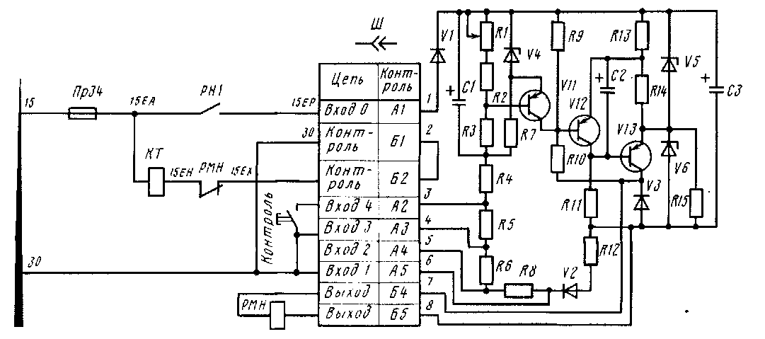 На вход блока через контакты Al, А5 штепсельного разъема подается напряжение питания цепей управления по цепи: провод 15, предохранитель Пр34, провод 15ЕА, замыкающий контакт реле напряжения РН1, провод І5ЕР, клемма А1, клемма А5, провод 30. Через контакты Б1, Б2 штепсельного разъема в цепь катушки КТ через размыкающий контакт РМН (провода 15ЕН—15ЕК) включена перемычка, соединяющая провода 15ЕК и 30, что позволяет контролировать включенное состояние штепсельного разъема.