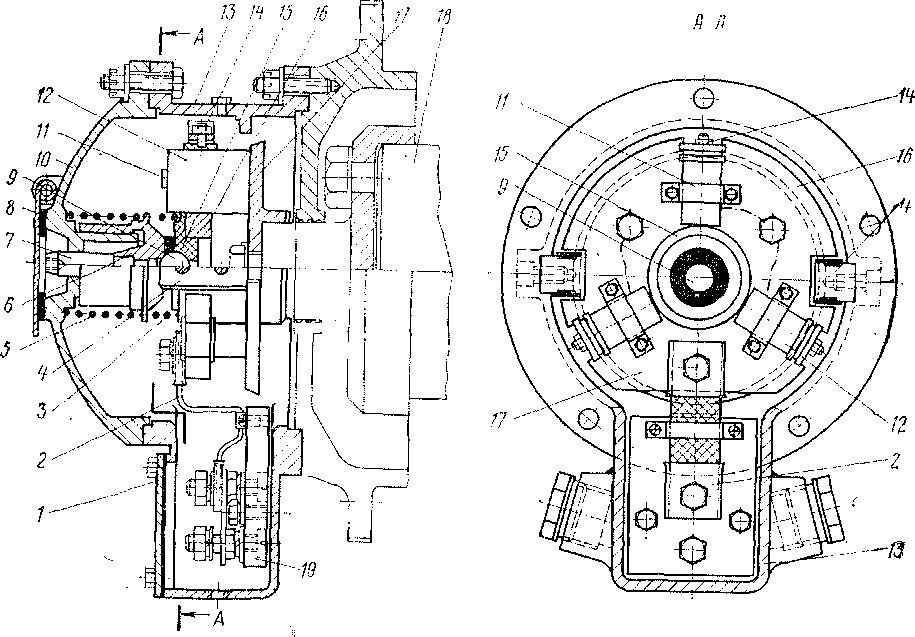 В крышке 10 имеется отверстие, закрытое маленькой откидной крышкой 8, предназначенное для проверки износа щеток. Износ щеток определяют измерением расстояния на торцовой поверхности штыря 7 до наружной плоскости крышки 10.