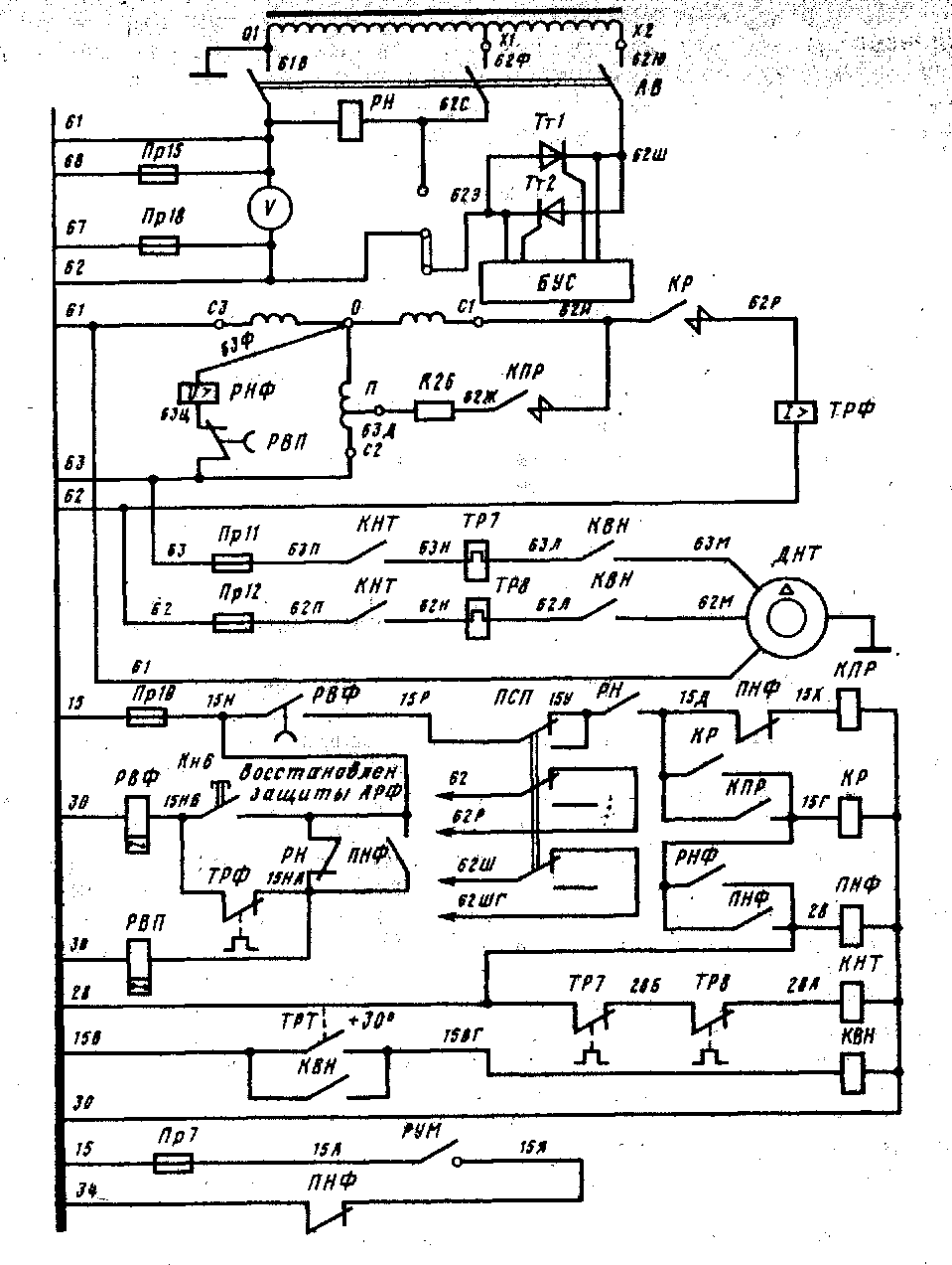 Для восстановления защиты необходимо включить кнопку «Восстановление защиты АРФ». При этом через контакт кнопки от провода 15Н получает питание катушка реле РВФ, которое переключает свои контакты, подготавливая схему включения расщепителя фаз к работе.
