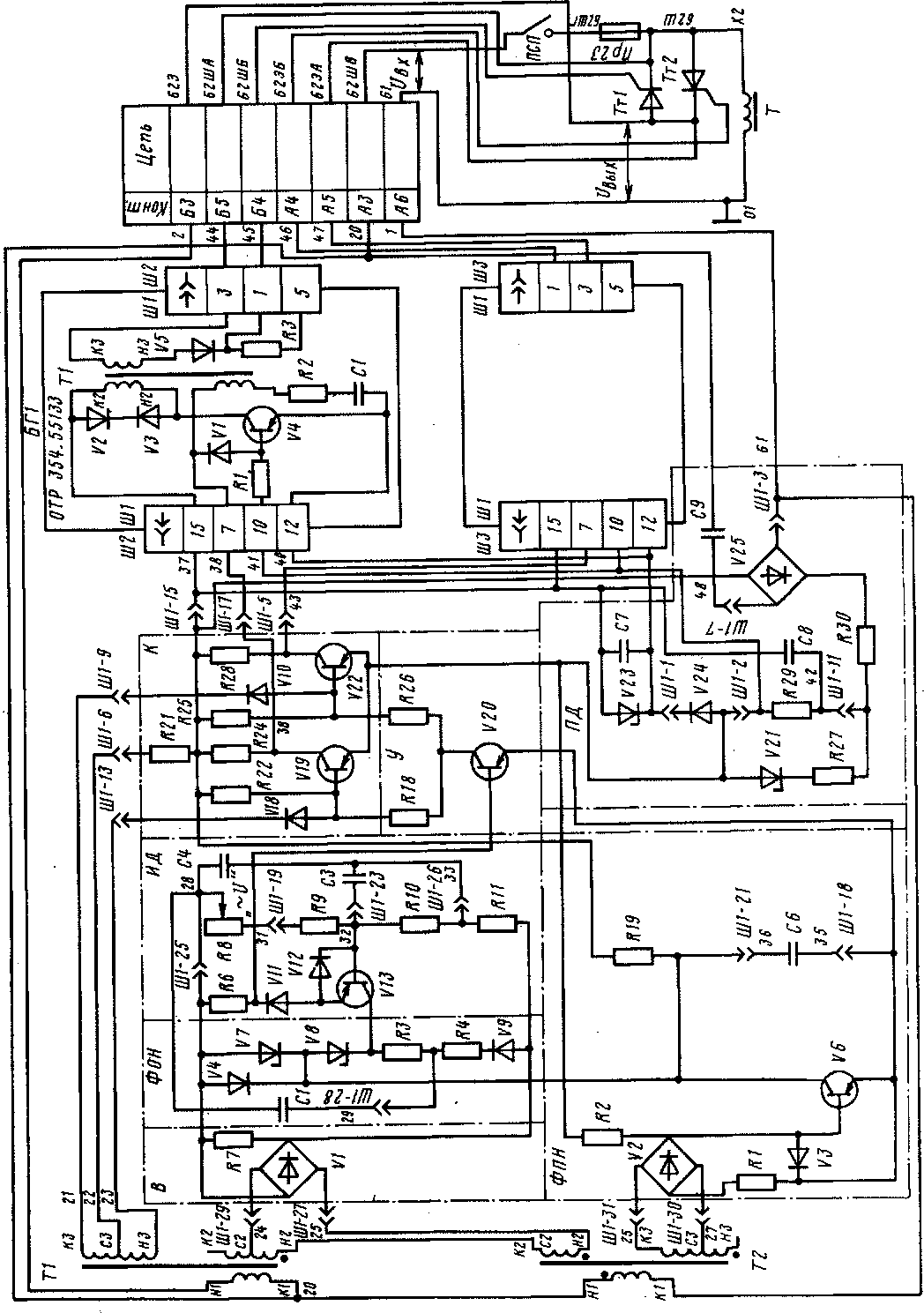 ИД содержит (см. рис. 252) резисторы /?#.../?//, конденсаторы СЗ, С4 и транзистор У13> включенный по схеме Эмиттерного повторителя. Выходное напряжение эмиттерного повторителя на резисторе Р6 пропорционально напряжению на выходе выпрямителя. ФОН предназначен для формирования опорного напряжения ІІ0. Он подключен к выходу выпрямителя VI и содержит стабилитроны У7, У8, диоды У4,У9, резисторы ЯЗ, Я4. ФПН вырабатывает пилообразное напряжение и„ частотой 100 Гц. Он состоит из конденсатора С6і транзистора У6, на которые подается через выпрямитель У2 выходное напряжение трансформатора Т2. Пилообразное напряжение и„ суммируется с опорным: напряжением £/0 и подается на вход усилителя У: Усилитель сравнивает подаваемое на его вход