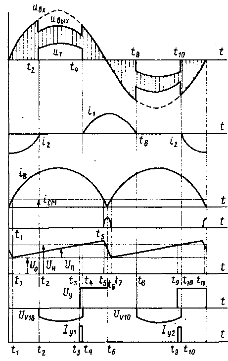 "вх — входное напряжение; ывых — выходное напряжение; цт — напряжение на тиристорах; іі, іг — токи тиристоров; /в — ток выпрямителя Х'2; /см — ток смешения транзистора У6; О0 — опорное напряжение; ип — пилообразное напряжение; ик — измеряемое напряжение; Ну — выходное напряжение усилителя; с/уіо> £/уі8 — напряжения на диодах 1<Т0, КІ8: /у| /у2 —токи управления тиристора
