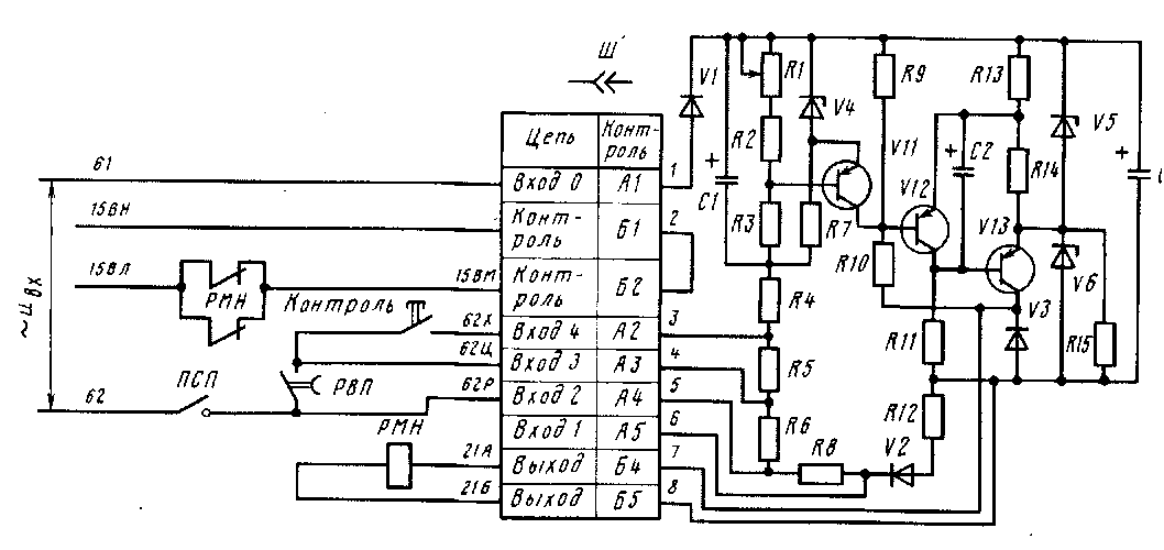 Защита от повышения переменного напряжения осуществляется с помощью блока защиты максимального напряжения БЗМН (рис. 254). Переменное входное напряжение подается на блок защиты через выводы А1, А4 штепсельного разъема по проводам 61, 62 через контакты пакетного переключателя ПС П. Катушка исполнительного реле РМН подключена к блоку БЗМН через контакты Б4, Б5 разъема. В цепь удерживающей катушки ВВ (провода 15ВН-15ВЛ) через контакты Б1, Б2 разъема включена перемычка, что позволяет контролировать включенное состояние штепсельного разъема, и последовательно с ней размыкающие контакты реле РМН. Через контакты АЗ, А4 к резистору Р6 подключен контакт реле РВП, позволяющий увеличить уставку защиты на время пуска системы.
