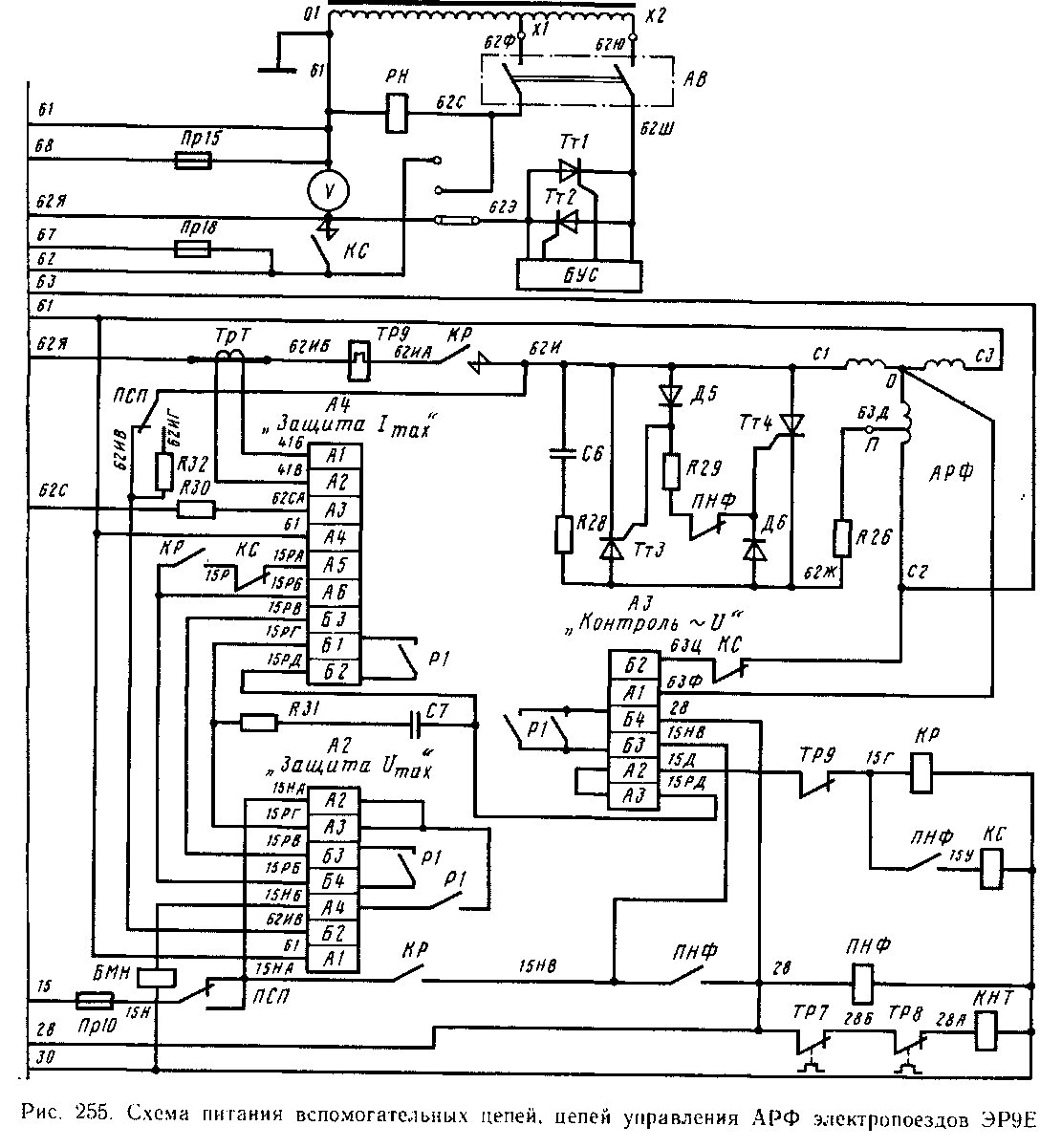 Блок управления стабилизатора переменного напряжения БУС служит для управления тиристорами Тт1 и Тт2. Подключение БУС (см. рис. 252) осуществляется штепсельным разъемом ШР1. На блок подается напряжение от вспомогательной обмотки тягового трансформатора по цепи: вывод Х2, 62Ш, предохранитель Пр23, 62ШГ, переключатель ПСҐІ, 62ШВ, клемма АЗ блока, клемма А6 блока, провод 61, вывод 01 обмотки трансформатора. Кроме этого, на вход БЗ блока подается питание от провода 62Э.