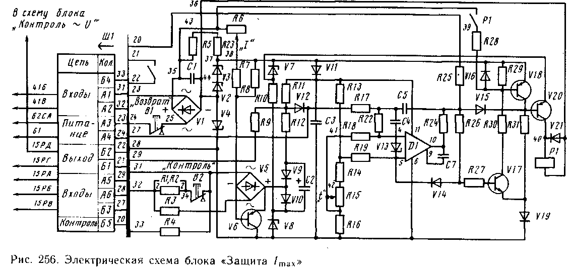 Блок A4 «Защита /тах» (рис. 256) содержит двухполупериодный выпрямитель VI, подключенный к источнику переменного напряжения (провода 61 и 62С) через контакты кнопки «Возврат-», контакты A3 и A4 разъема Ш1 и внешний резистор R30.