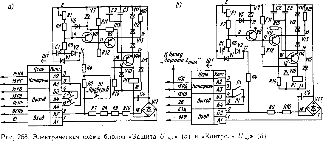 Блок А2 «Защита с/П1ах» (рис. 258) содержит: однополупериодный выпрямитель, на выход которого включен измерительный делитель напряжения на резисторах Р1—/?5; выпрямительный мост У17, к которому подключен питающий делитель на стабилитронах У11—У13, У15 и резисторах Р7—Р10; формирователь опорного напряжения на стабилитроне У7 и резисторе Я13; усилитель на транзисторах У8, У9, У14 и исполнительное реле Р1.