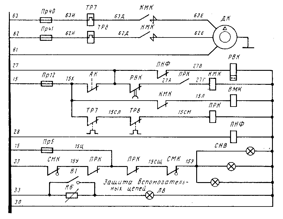 Электродвигатель насоса трансформатора ДНТ защищен от перегрузок тепловыми реле ТР7 и ТР8 и от коротких замыканий предохранителями ПрП и Пр12. При срабатывании тепловых реле их блокировки в проводах 28—28А отключают контактор КНТ. При неработающем ДНТ во избежание перегрева трансформатора не должно быть тяговых нагрузок на трансформаторе. Для этого при неработающем ДНТ блок-контакт КНТ в проводах 11Г-11Д отключает контактор Л/С/.