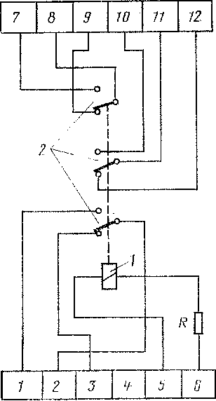 и отключается при напряжении 15—20 В. Катушка имеет сопротивление 1500 Ом±5%, максимальный зазор между контактами 1,2 мм, вес реле 1,5 кг. В качестве промежуточного реле сигнализации 542 о боксовании использовано двухобмоточное реле РчЬШ43, блокировочные контакты которого рассчитаны на ток 2 А. Катушки имеют сопротивление по 1500—1600 Ом. Последовательно одной из катушек, включен регулируемый резистор ТР626 на 560 Ом. Обычно его устанавливают на сопротивление 200 Ом. Параллельно двум последовательно включенным катушкам присоединен конденсатор ТС561 01-100/110-150 для получения прерывного включения контактов. Частота включения реле составляет 80—140 в минуту. Для исключения воздействия реле боксования на систему сигнализации и защиты при отключенных тяговых двигателях 3 или 4 на электровозах 34Е установлено аварийное реле 548, контакты которого исключают действие реле боксования 142. Аварийное реле. РчР-100 (рис. 205) состоит из электромагнита 1 и трех переключающих блок-контактов 2.