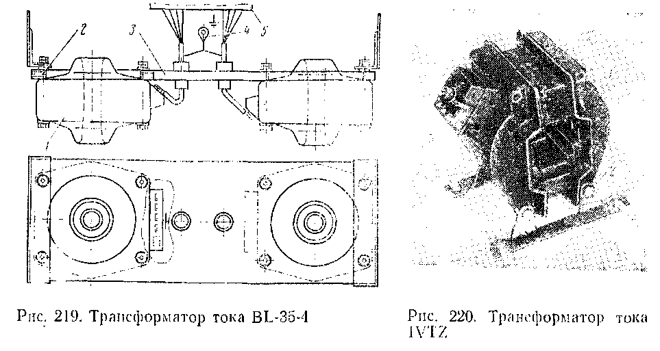 В цепи отопления поезда установлен трансформатор тока \У12 (рис. 220). Сердечник магнитопровода со вторичной обмоткой трансформатора помещен в изоляционный кожух /, состоящий из двух симметричных частей, соединенных болтами 2. Выводы вторичной обмотки подключены к зажимам в коробке, закрытой крышкой 3. Первичной обмоткой служит токоведущая шина, которая проходит через отверстие в корпусе трансформатора.