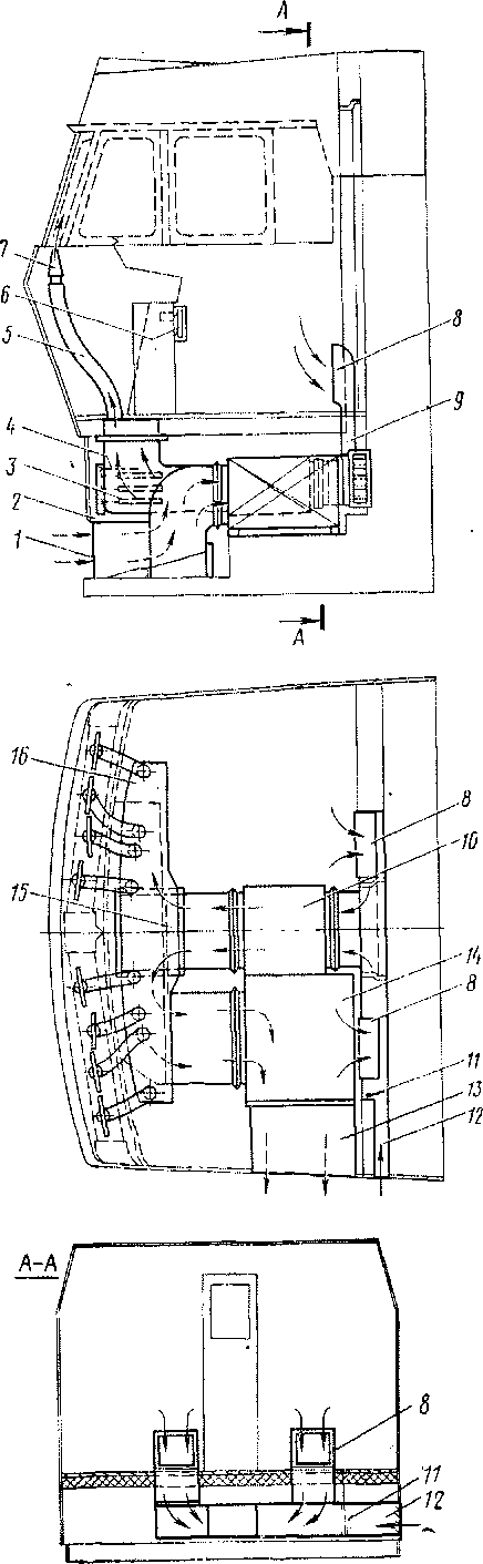 Всасывание в систему кондиционирования свежего воздуха осуществляется через закрытое сеткой отверстие 12 (см. рис. 223). Количество поступающего воздуха может регулироваться клапаном 11, управление которым осуществляется из кабины машиниста. По входному воздуховоду наружный воздух подается к вентилятору, где смешивается с рециркуляционным воздухом, поступающим из кабины машиниста через отверстия 8 по каналу 9. Воздух прогоняется вентилятором через испаритель (где от него отбирается тепло) в воздухораспределитель 2, откуда через распределительный канал 16 подводится резиновыми рукавами 5 к соплам 7, а затем выходит в пространство кабины машиниста.