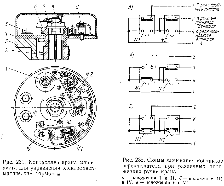 Контроллер (рис. 231) для управления электропневматическими тормозами устроен следующим образом. Диск 4 контроллера двумя болтами 5 крепится к кронштейну 3. На диске 4 винтами 10 крепятся два переключателя 9 типа КВМ-9. Кулачок 6 контроллера закреплен на стержне при помощи лыски и гайки 7. Контроллер закрыт штампованной крышкой 8. Четырехжильный кабель 1 контроллера снабжен штепсельным разъемом для подключения в цепь электропневматического тормоза. При помощи винтов 10 зазор между кулачком 6 и головкой толкателя устанавливают в пределах 0,9—1 мм. Схемы замыкания контактов переключателей 9 при различных положениях ручки 2 крана машиниста показаны на рис. 232.