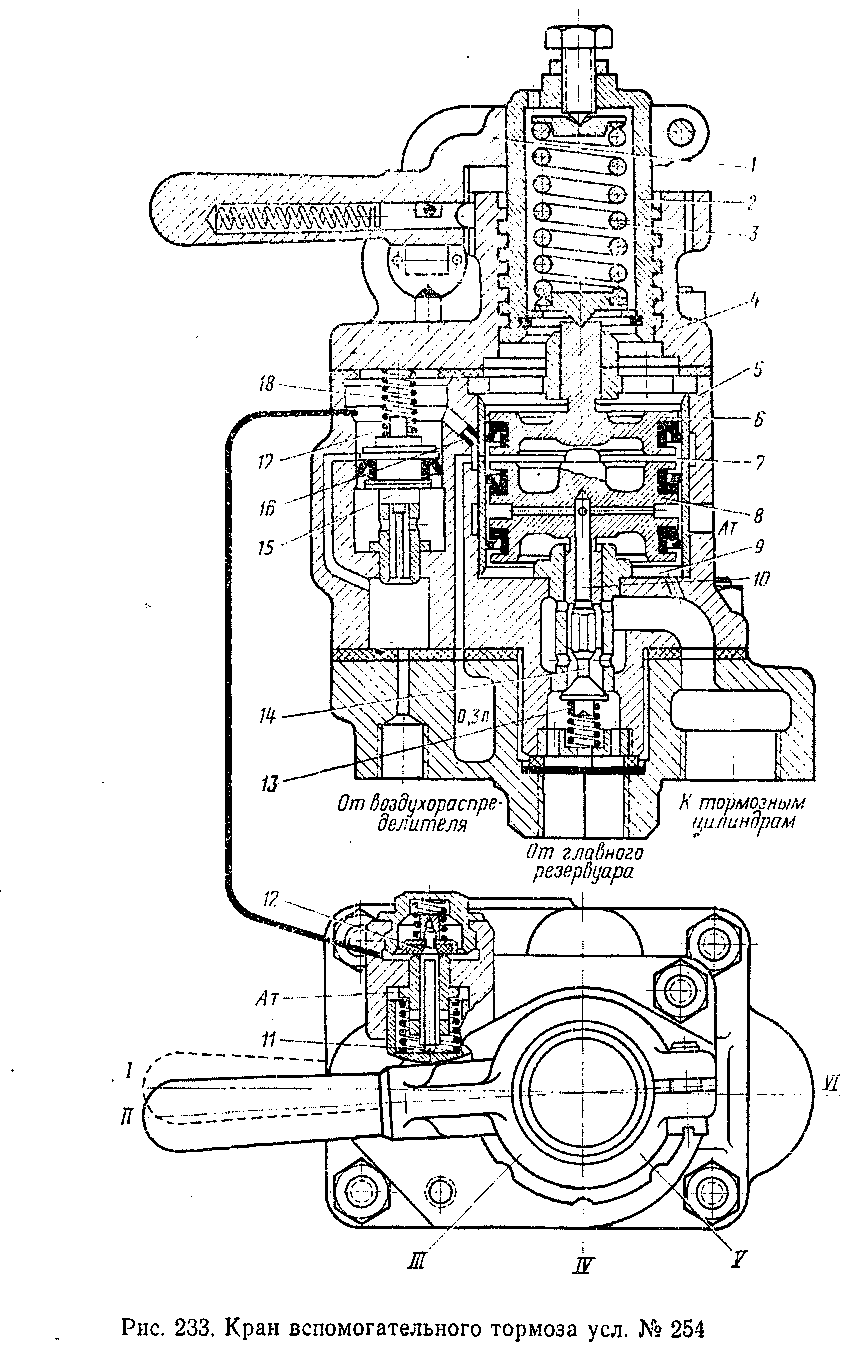 Кран вспомогательного тормоза усл. № 254 (рис. 233) предназначен для независимого управления тормозами. Он состоит из трех частей: верхней— регулирующей с ручкой для независимого управления тормозами локомотива; средней — повторителя или реле, осуществляющей впуск и выпуск воздуха из тормозных цилиндров локомотива; нижней — плиты для подвода труб и крепления крана.