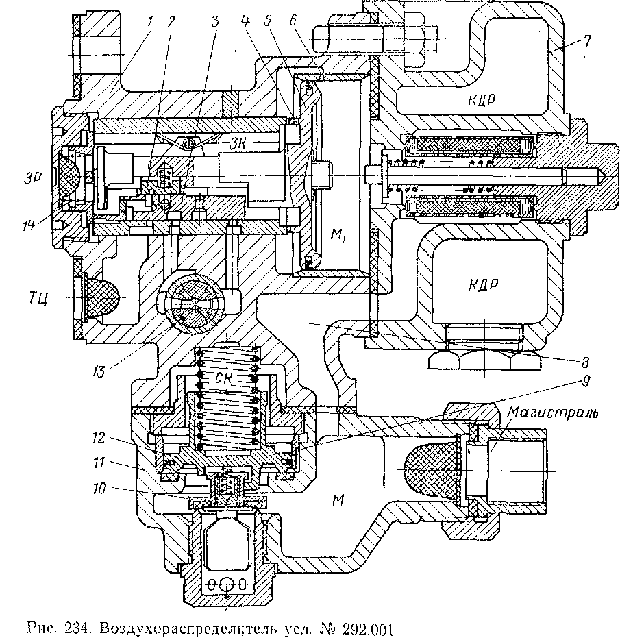 Воздухораспределитель усл. №292.001. Он обеспечивает эффективную дополнительную разрядку тормозной магистрали при служебном и экстренном торможениях и имеет два режима: К — поезд нормальной длины, Д —■ длинносоставный (свыше 20 вагонов) поезд. Он состоит из магистральной части 1 (рис. 234) с режимным переключате-
