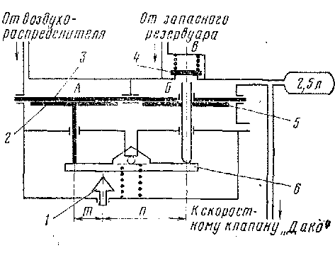 При торможении воздух от воздухораспределителя поступает в камеру А, пригибает диафрагму 3 и давит на поршень 2. Последний передает усилие на балансир 6, который, вращаясь вокруг подвижной опоры 1, давит на поршень 5, и тот открывает двойной клапан 4. Воздух из запасного резервуара по каналу В поступает в камеру Б, наполняет резервуар объемом 2,5 л и поступает в камеру Ж скоростного клапана «Дако» (см. рис. 239). Клапан 4 остается открытым до тех пор, пока действующая через балансир 6 на поршень 5 сила не уравновесит силу, действующую на поршень 2.