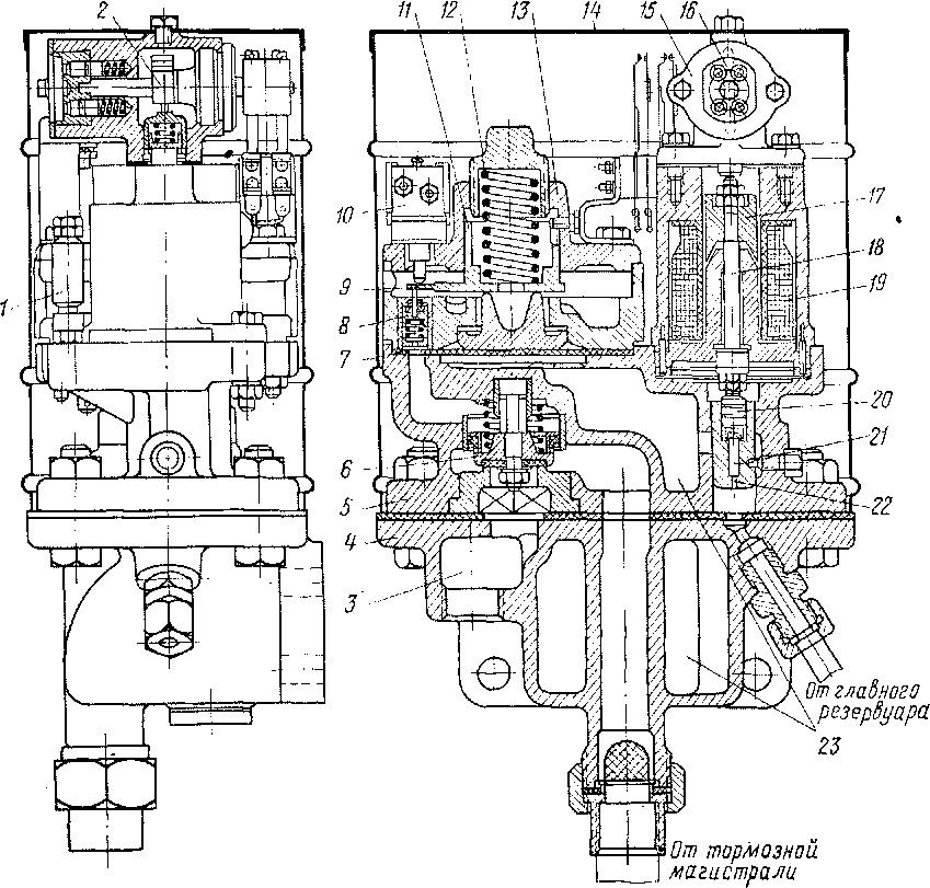 В кронштейне 4 расположены камера выдержки времени 23 объемом 1 л, два отвода для соединения с напорной (главным резервуаром) и тормозной магистралью, а также атмосферный канал 3.