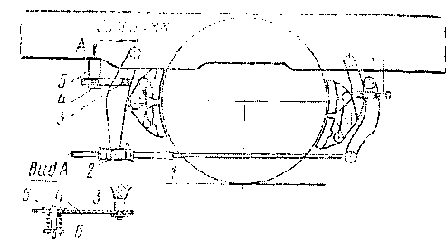 Внутри корпуса на резьбовую часть тяги 1 (рис. 246) надета разрезная гайка 2, четыре сегмента которой стягиваются пружиной 3, а для предупреждения взаимного осевого смещения снабжена кольцом 4. С одной стороны гайка 2 имеет коническую поверхность, которая соприкасается с коническим седлом корпуса при торможении. Направление движения тяги в корпусе регулятора обеспечивается концевым упором 5.