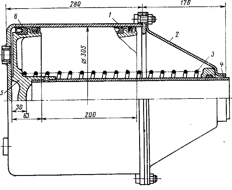 Цилиндр состоит из сварного корпуса / (рис. 264), закрытого направляющей крышкой 2. Крышка прикреплена к фланцу корпуса шестью болтами. Внутри цилиндра помещен поршень 5, отжатый в крайнее положение отпускной пружиной 3. Шток свободно вставляется в направляющую трубу 4, проходящую через отверстие в направляющей крышке. Сферической головкой шток свободно упирается в выемку поршня. Другим концом шток шарнир-но соединен с рычажной передачей. Во избежание утечки воздуха поршень своим резицовым воротником 6 плотно прилегает к поверхности цилиндра.