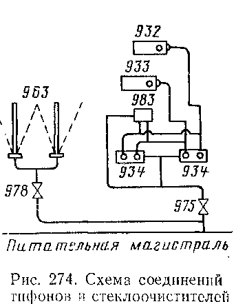 Управление тифонами производится ножной кнопкой 983 или двойными клапанами 934, смонтированными в каждой кабине как со стороны машиниста, так и со стороны его помощника (см. рис. 274).