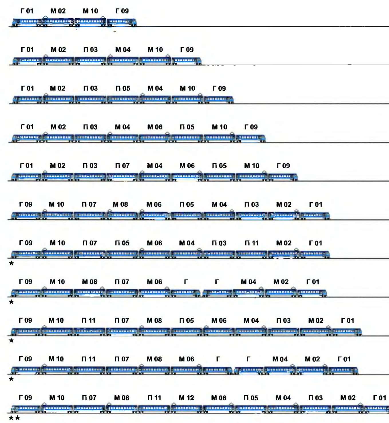 Основные варианты формирования электропоездов всех серий — из 10 вагонов. В зависимости от интенсивности пассажиропотоков электропоезда серий ЭД9М и ЭД9Т могут быть сформированы из 11, 10, 9, 8, 7, 6 и 4 вагонов, а поезда серии ЭР9П - из 12, 10, 8, 6 и 4 вагонов. Схемы формирования показаны на рисунке 1.1. Для обеспечения автономности поезда число вагонов в нем должно быть