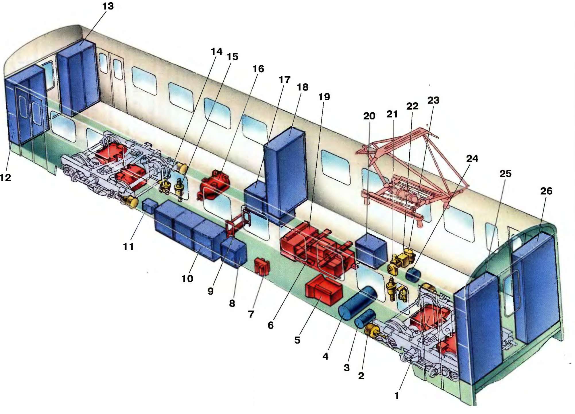 1 - тяговый двигатель; 2 - тормозной цилиндр; 3 - воздушный резервуар объемом 55 л.; 4 - воздушный резервуар объемом 170 л; 5 - охладитель тягового трансформатора; 6 - тяговый трансформатор; 7- ограничитель перенапряжения; 8 — ящик с выпрямителем; 9 — пусковой резистор расщепителя фаз; 10 — ящик с тормозным контроллером: 11 — блок управления установки аэрозольного пожаротушения; 12 — шкаф № 4; 13 — шкаф № 5; 14 — сигнализатор отпуска тормозов; 15 — сбрасывающий клапан; 16 — расщепитель фаз; 17 - ящик с реостатным контроллером и реверсором; 18 - шкаф № 3; 19 - ящик с высоковольтным вводом; 20 - ящик с линейными контактороми; 21 - воздухораспределитель усл. № 292; 22 - рабочая камера воздухораспределителя; 23 - электровоздухораспределитель усл. № 305; 24 - воздушный резервуар объемом 16 л; 25 - шкаф № 2; 26 - шкаф № 1