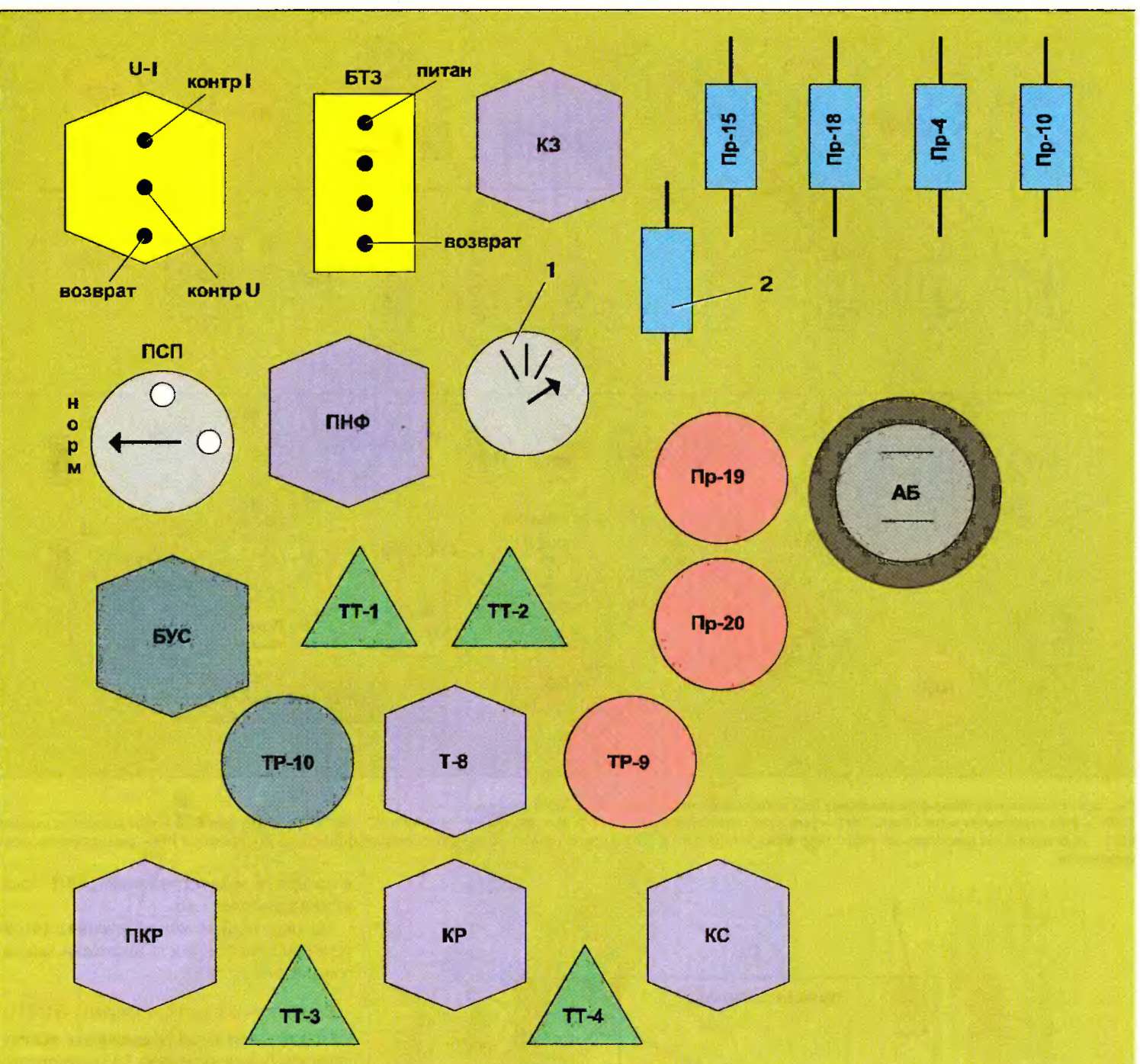 Пр15 — предохранитель в цепи освещения салона (пр68); Пр18 — предохранитель в цепи освещения салона (пр67); ПрЮ — предохранитель в цепи управления фазорас-щепителем; ПСП — переключатель систем питания; Пр20 — предохранитель защиты фазорасщепителя при замыкании; ПНФ — промежуточное реле напряжения фазо-расщепителя: БУС — блок управления стабилизации; Тт1, Тт2 — тиристоры в цепи БУС
