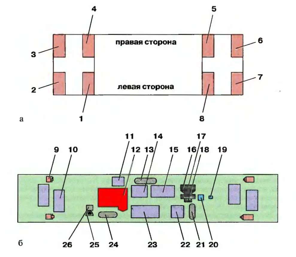 Рис. 1.14. Расположение шкафов и подвагонного оборудования моторного вагона электропоезда ЭД9П: а — расположение шкафов; б — расположение подвагонного оборудования; 1 — левый передний шкаф; 2 — левый лобовой шкаф; 3 — правый лобовой шкаф; 4 — правый передний шкаф; 5 — правый задний шкаф; 6 — правый торцовый шкаф; 7 — левый торцовый шкаф; 8 — левый задний шкаф; 9 — тормозной цилиндр; 10—тяговый двигатель; 11 — ящик с сопротивлениями; 12 — силовой трансформатор; 13 — воздушный резервуар объемом 78 л; 14 — сглаживающий реактор; 15 — ящик с выпрямительной установкой; 16 — фильтровая камера; 17 — вентилятор; 18 — расщепитель фаз; 19 — реле давления; 20 — запасной резервуар; 21 — воздушный резервуар объемом 55 л; 22, 23 — ящики с контакторами; 24 — воздушный резервуар объемом 55 л; 25 — электровоздухораспределитель; 26 — воздухораспределитель