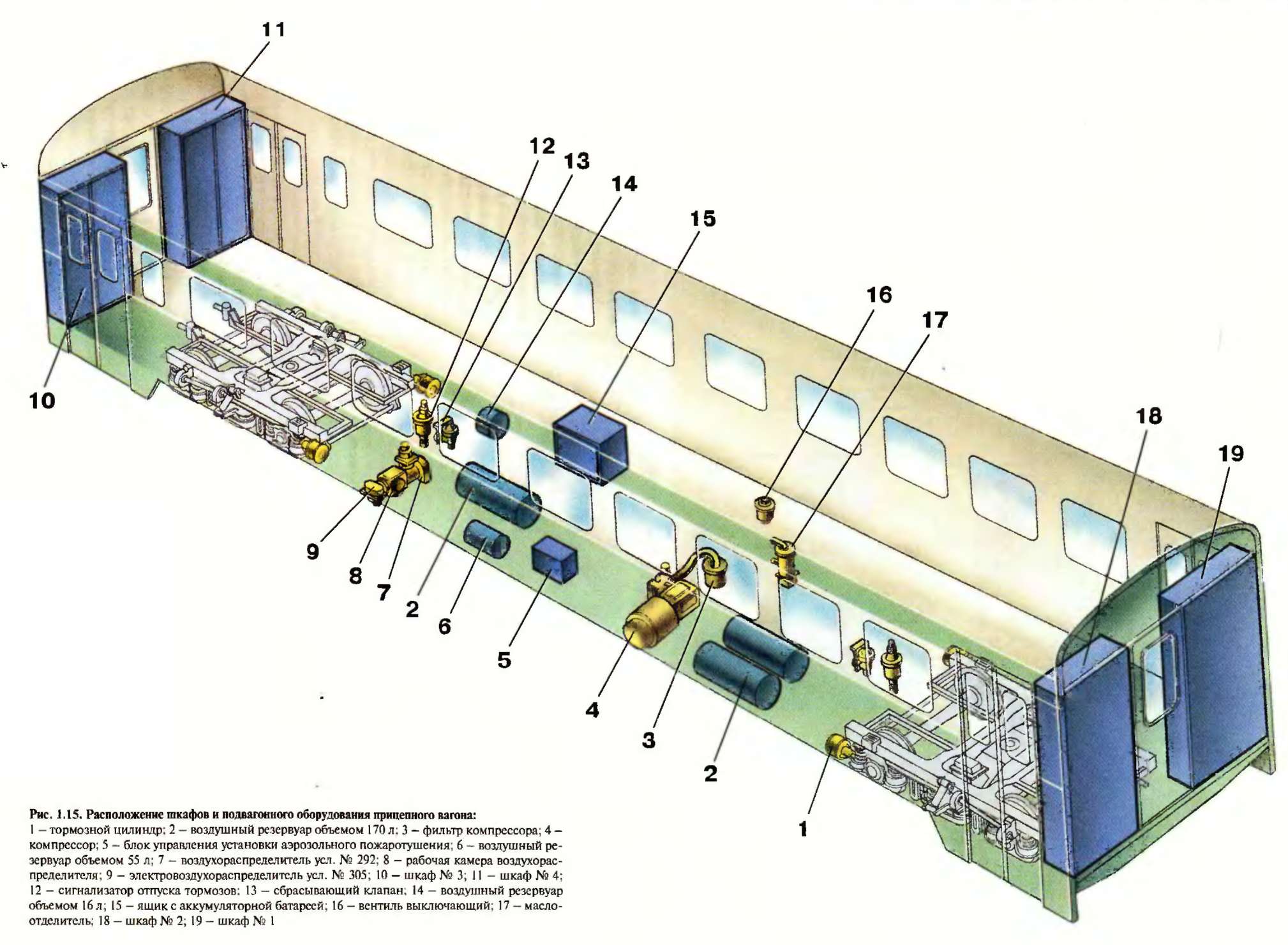 Под кузовом вагона размещены: аккумуляторная батарея (см. рис. 1.17), маслоотделитель, влагосборник, два главных резервуара объемом 170 л каждый, тормозной цилиндр, электровоздухораспределитель, воздухораспределитель, запасный резервуар объемом 78 л, электрокомпрессор. В переднем тамбуре вагона имеются два шкафа.