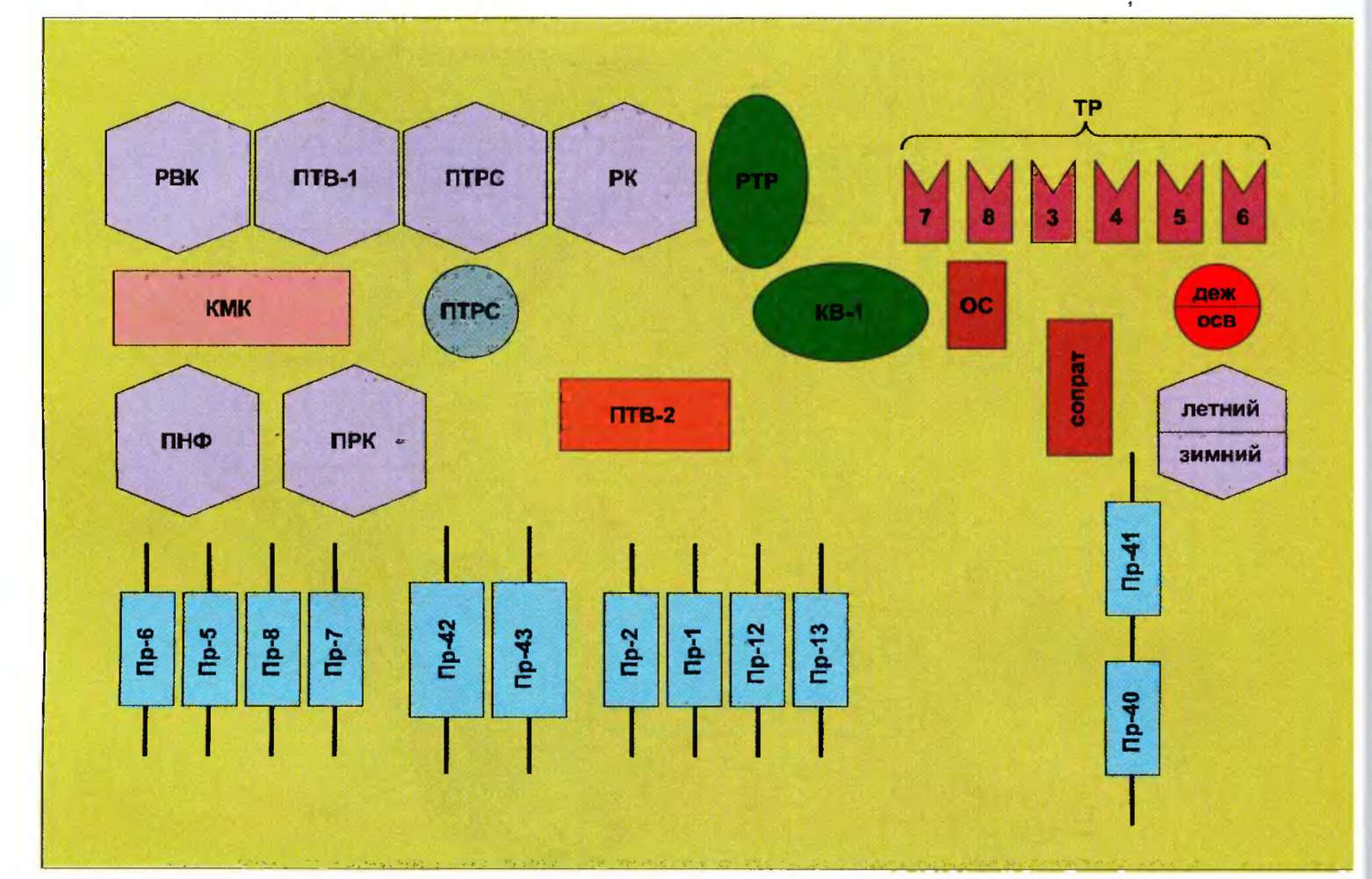 Рис. 1.16. Расположение оборудования в шкафу № 4 прицепного вагона электропоезда ЭД9Т: ПРК — промежуточное реле компрессора; ОС — контактор освещения