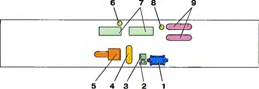 1 — тормозной цилиндр; 2 — электровоздухораспределитель; 3 — воздухораспределитель.; 4 — воздушный резервуар объемом 78 л; 5 — компрессор; 6 — маслоотделитель; 7 — ящик с аккумуляторной батареей; 8 — влагосбор-ник; 9 — воздушный резервуар объемом 170 л