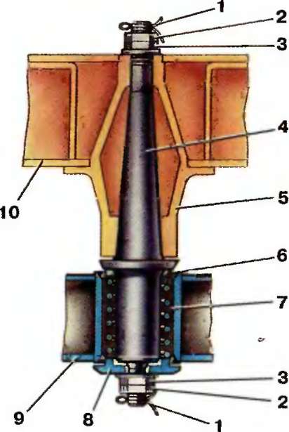 1 — шплинт; 2 — контргайка; 3 — гайка; 4 — шкворень; 5 — пятник; 6 — металлическая шайба; 7 — резиновая втулка; 8 — упорная шайба; 9 — надрессорный брус; 10 — шкворневая балка