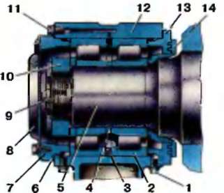 Рис. 4.14. Букса моторного вагона: 1,11— пробки; 2 - подшипник; 3 - большое дистанционное кольцо; 4 — малое дистанционное кольцо; 5 — ось колесной пары; 6 — уплотнительное кольцо; 7 — крышка; 8 — смотровая крышка; 9 — стопорная планка; 10 - торцовая гайка; 12 —корпус буксы; 13 — задняя крышка; 14 — лабиринтное кольцо