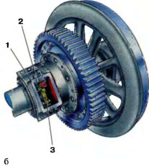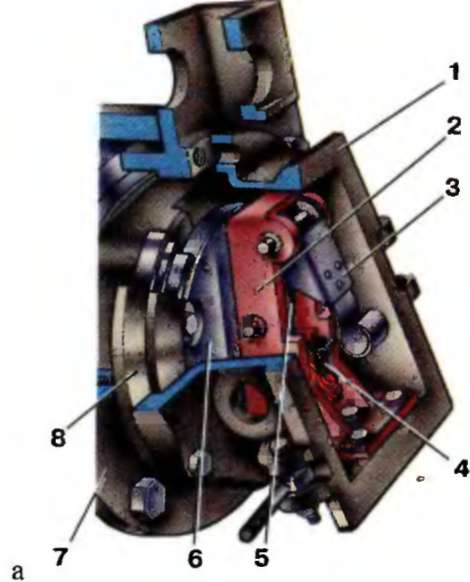 а — электропоездов серий ЭД9М и ЭД9Т; б — электропоезда серии ЭР9П; 1 — корпус; 2 — щеткодержатель; 3 — рычажное устройство; 4 — щетка; 5 — пружина; 6 — токосъемная крышка; 7 — букса; 8 — лабиринтная крышка