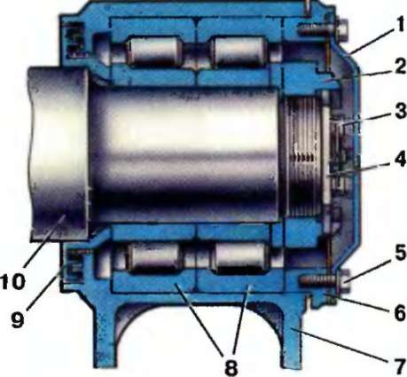 I — смотровая крышка; 2 — торцовая гайка; 3, 5 -болт; 4 — стопорная пластина; 6 — крышка; 7 -корпус буксы; 8 - подшипник; 9 — лабиринтное кольцо; 10 — ось колесной пары