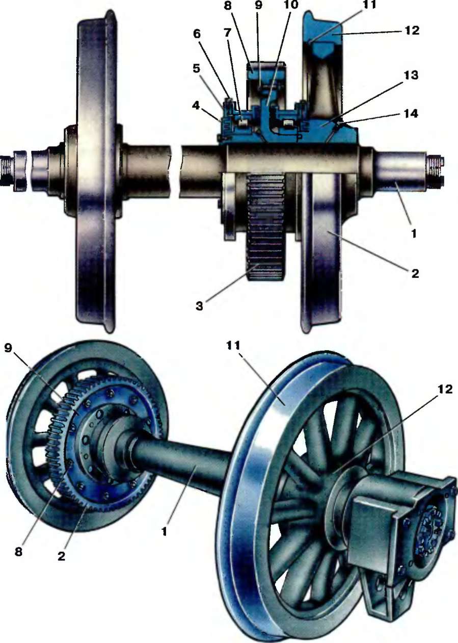 а — электропоездов ЭД9М и ЭД9Т, б — электропоезда ЭР9М; I — ось колесной пары; 2 — колесный центр; 3 — зубчатое колесо; 4, 5 — лабиринтные крышки; 6 — обойма подшипника; 7 — подшипник; 8 — венец зубчатого колеса; 9 — призонный болт; 10 — ступица зубчатого колеса; 11 — бандажное кольцо; 12 — бандаж; 13 — ступица колеса; 14 — пробка