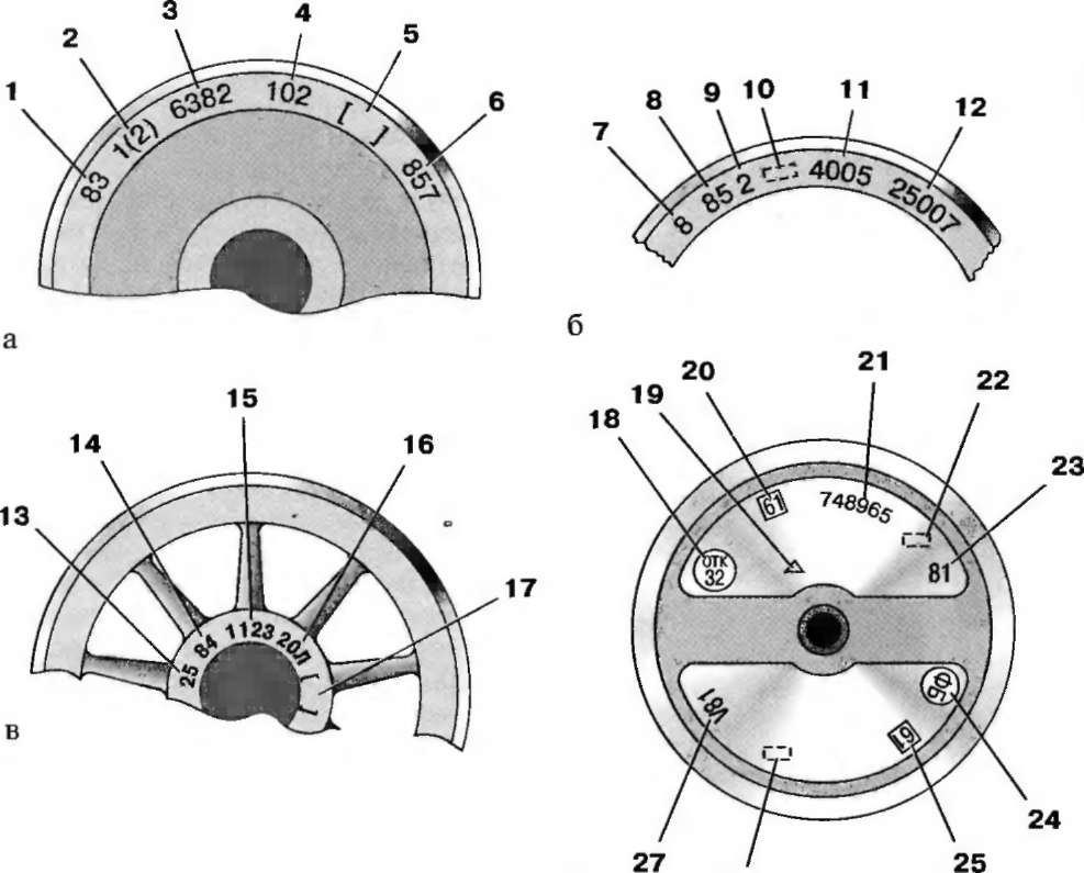 а — на наружной боковой поверхности обола цельнокатаного колеса; б — на наружной грани бандажа; в — на наружном торце ступицы центра; г-на правом торце колесной пары; 1, 8, 14, 23 — год изготовления (две последние цифры); 2, 16 — марка стали; З, 11 — номер плавки; 4 — условный номер предприятия-изготовителя; 5, 17 — клейма технического контроля предприятия-изготовителя и представителя заказчика; 6 — порядковый номер колеса по системе нумерации предприятия-изготовителя; 7, 13 — условный номер или товарный знак предприятия-изготовителя; 9 — марка бандажа; 10 — клейма приемника; 12 — порядковый номер бандажа по системе нумерации предприятия-изготовителя; 15 — порядковый номер центра по системе нумерации предприятия-изготовителя; 18 — клейма приемки ОТК; 19 — клейма, удостоверяющие правильность переноса знаков маркировки; 20 — условный номер завода, обработавшего ось; 21 — порядковый номер оси, начинающийся с номера завода-изготовителя поковки; 22 — клейма приемщика МПС; 24 — клейма формирования и балансировки; 25 — условный номер предприятия, сформировавшего колесную пару; 26 — клейма приемки; 27 — дата формирования