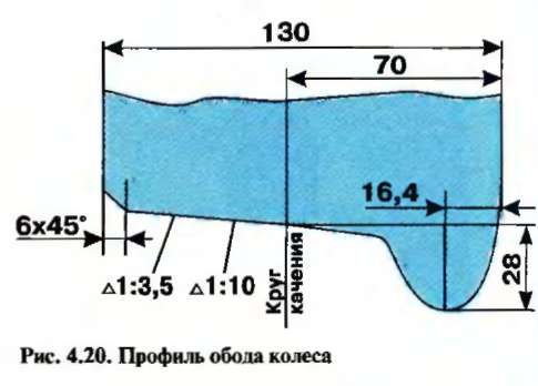 поверхность бандажа называется поверхностью катания, ее делают двойной конической с конусностями 1:10 и 1:3,5 (рис. 4.20). Двойная конусность позволяет колесной паре самоустанавливаться в рельсовой колее на прямых участках пути и улучшает условия прохождение кривых, уменьшая пробуксовку, и, следовательно, износ бандажа. Рабочей поверхностью катания является участок с конусностью 1:10. Наружная часть бандажа с конусностью 1:3,5 изнашивается мало, так как работает только при движении по кривым малого радиуса и облегчает нормальное прохождение стрелочных переводов при большом износе колеса.
