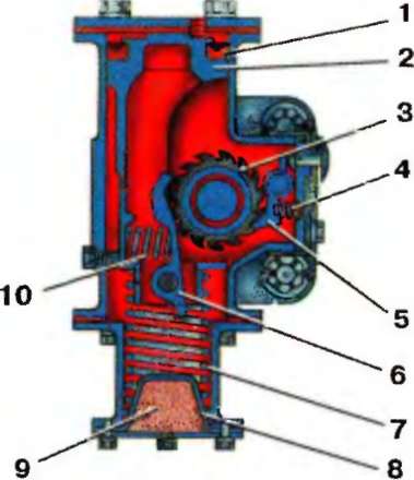Если при износе тормозных колодок величина хода штока превысит установленную норму, в процессе наполнения тормозного цилиндра воздух проходит через открывшееся отверстие штуцера в полость над поршнем 2. Когда давление в этой полости достигнет примерно 2 кгс/см2, поршень преодолеет усилие пружины 7 и опустится до упора в стакан 8. При этом собачка 6, шарнирно установленная на поршне и прижатая к храповому колесу 3 пружиной 10, проскакивает, не поворачивая это колесо.