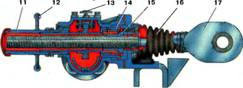 I — манжета; 2 — поршень; 3 — храповое колесо; 4, 7, 10 — пружины; 5,6 — собачки; 8 — стакан; 9 — фильтр; 11 ■ втулка; 12 — рукоятка; 13 — штифт; 14 — шпиндель; 15 — гайка; 16 — чехол; 17 — тяга