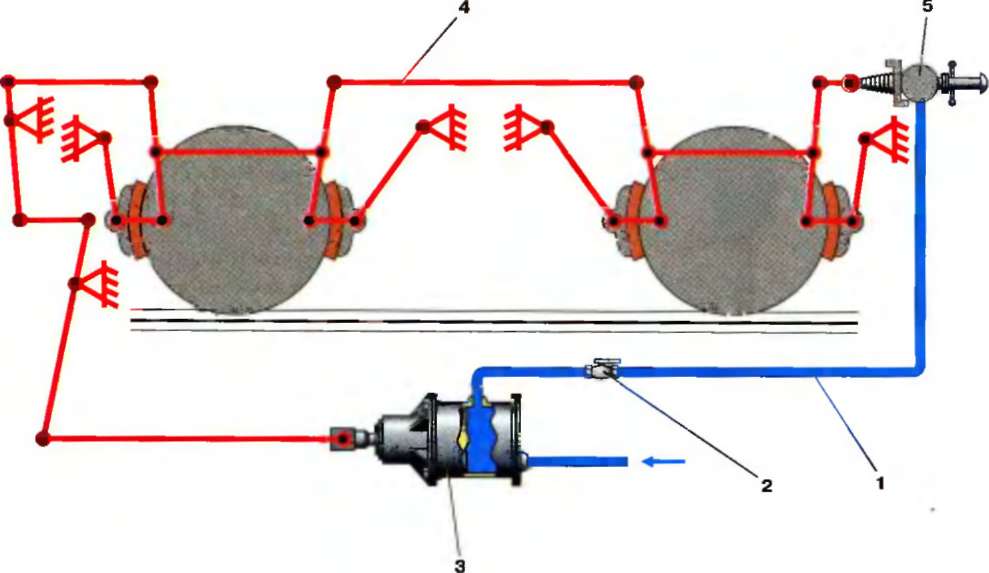 1 — трубка от тормозного цилиндра к авторегулятору; 2 — разобщительный кран; 3 -рычажная тормозная передача; 5 — авторегулятор выхода штока