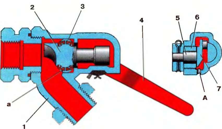 I — корпус; 2 — клапан; 3 — уплотнительное кольцо; 4 — ручка; 5 — эксцентриковый кулачок; 6 — гайка; 7 — палец клапана; А — атмосферное отверстие; а — отверстие диаметром 2,5 мм
