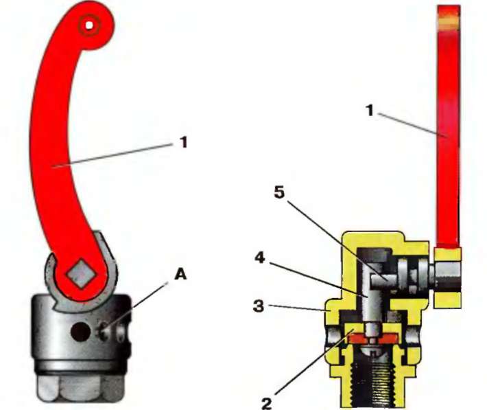 1 — ручка; 2 — клапан; 3 — корпус; 4 — стержень; 5 — палец эксцентрикового кулачка; А — атмосферное отверстие