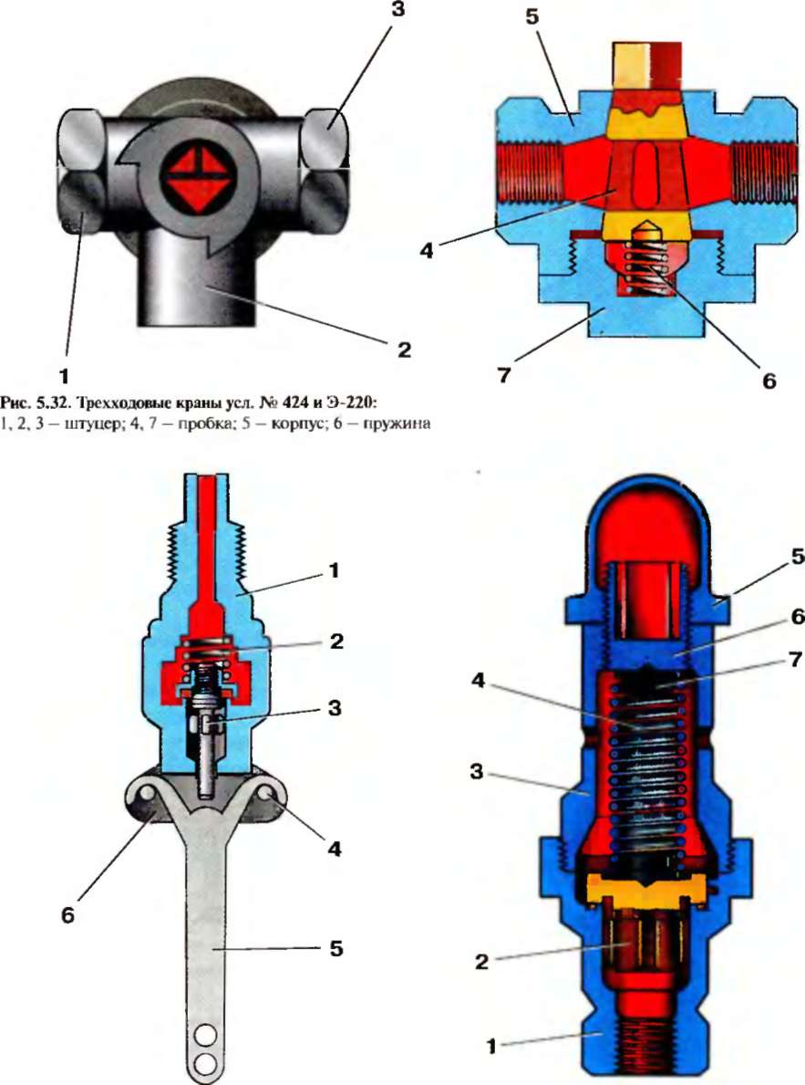Концевой кран усл. № 190 (рис. 5.30) состоит из корпуса 1, клапана 2 с отражателем на торце, двух резиновых колец 3, эксцентрикового кулачка 5, гайки 6 и ручки 4, которая закреплена на квадратном хвостовике кулачка шплинтом.