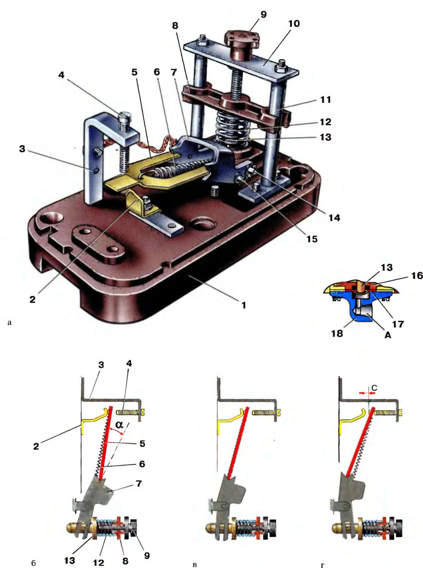 При вращении винта 9 перемещается планка 8, чем регулируется усилие пружины 12. Рычаг 7 имеет две оси: подвижную 14, расположенную в штоке 13 и неподвижную 15 — в направляющей 16. Выступы подковообразного подвижного контакта 5 прижаты контактной пружиной 6 к рычагу 7.