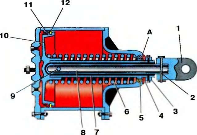 1 — головка штока; 2, 9 — палец; 3 — упорное кольцо; 4 — резиновая шайба; 5 — сетчатый фильтр; 6 — пружина; 7 — направляющая труба; 8 — шток; 10 — поршень; 11 — манжета поршня; 12 — войлочное кольцо; А — атмосферное отверстие.